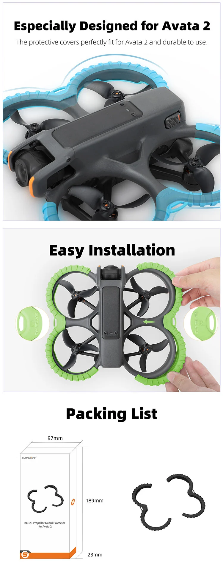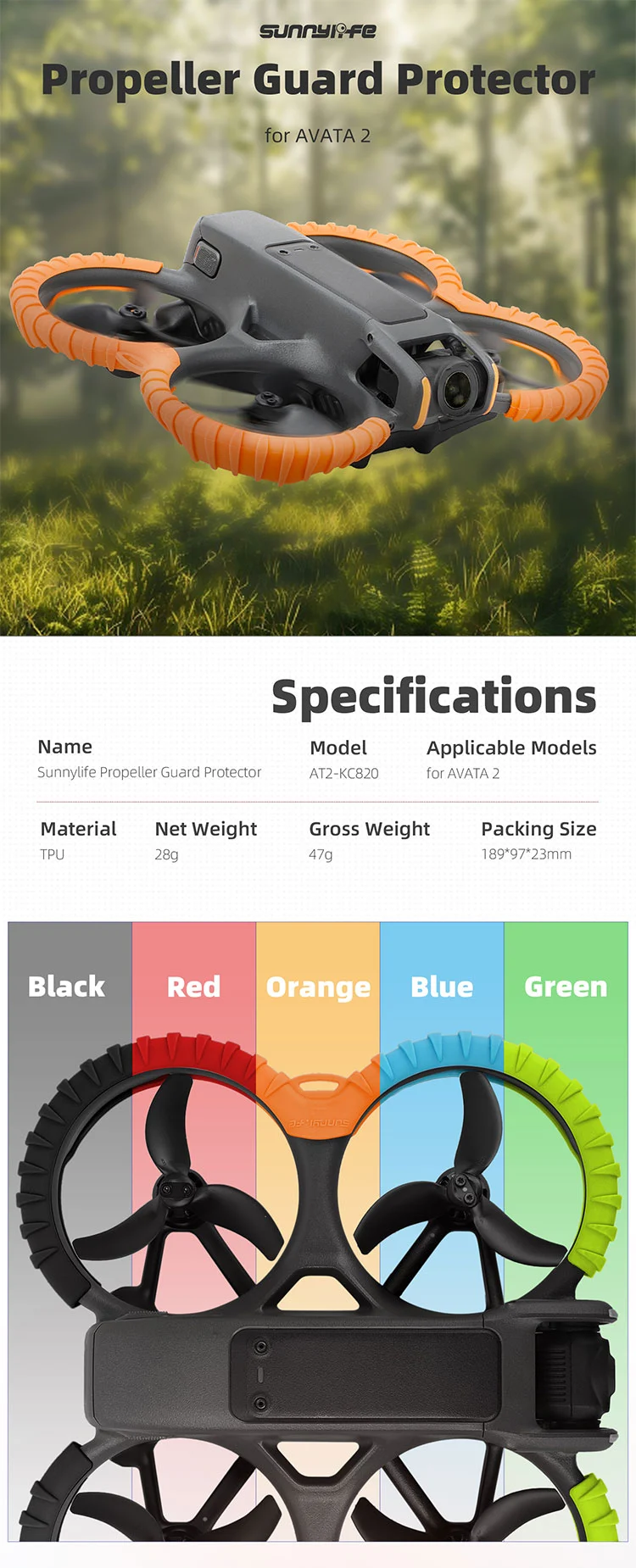 - ضد برخورد و ضد آسیب. نوارهای TPU ضد برخورد، استحکام را افزایش داده و پهپاد شما را ایمنتر میکنند. طراحی سبک. حلقههای محافظ تنها ۲۸ گرم وزن دارند و به سختی بر استقامت پرواز تأثیر میگذارند. به طور ویژه برای Avata 2 طراحی شدهاند.